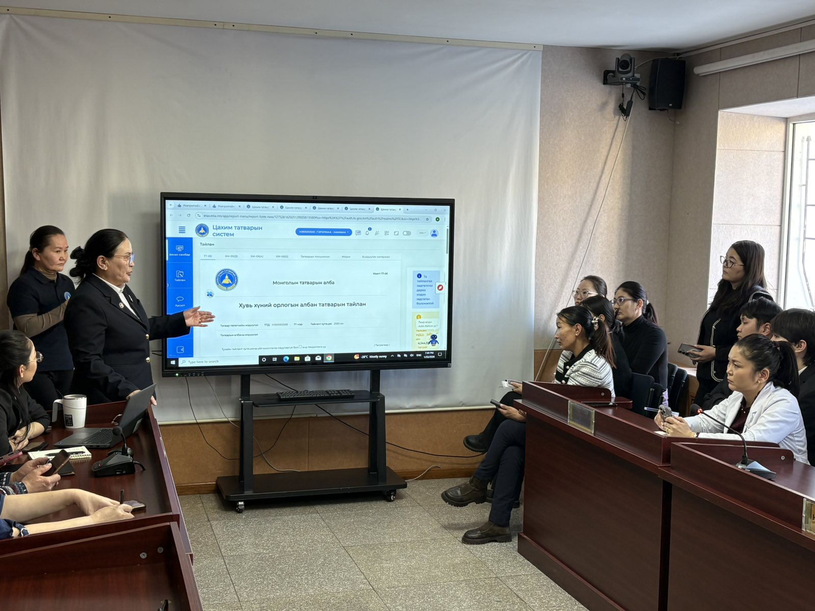 Төв аймгийн Татварын газраас татварын улсын байцаагч П.Оюунжаргал, Ө.Ууганням нар 2026 оны 1 сарын 23-ны өдөр ирж Төв аймаг дахь шүүхийн шүүгч ажилчдад хувь хүний орлогын албан татварын тайлангаа цахимаар илгээх талаар мэдээлэл хийж сургалт орлоо.
